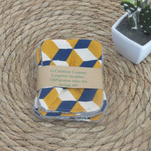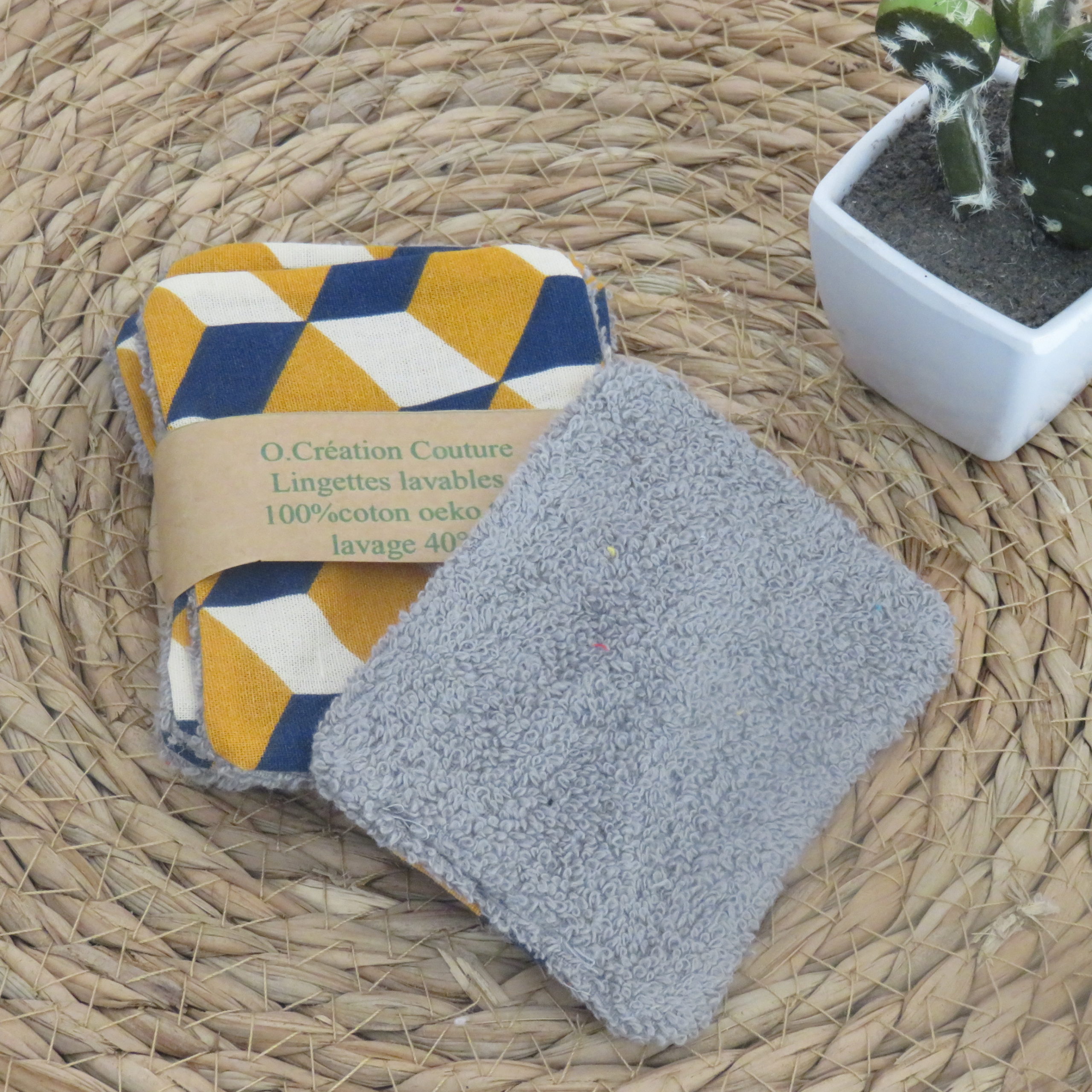 Descriptif : Lot de 5 lingettes démaquillantes lavables, fabrication artisanale en tissu éponge et tissu imprimé. Les lingettes sont économiques, écologiques (plus de coton jetés à la poubelle) et se lavent en machine. Idéal pour le démaquillage avec ou sans produit. Ce lot est idéal pour débuter et tester les lingettes lavables; elles sont fabriquées à partir de mes chutes de tissu et d’éponge afin de diminuer les déchets de l’atelier ainsi que vous les proposer à un tarif raisonnable.